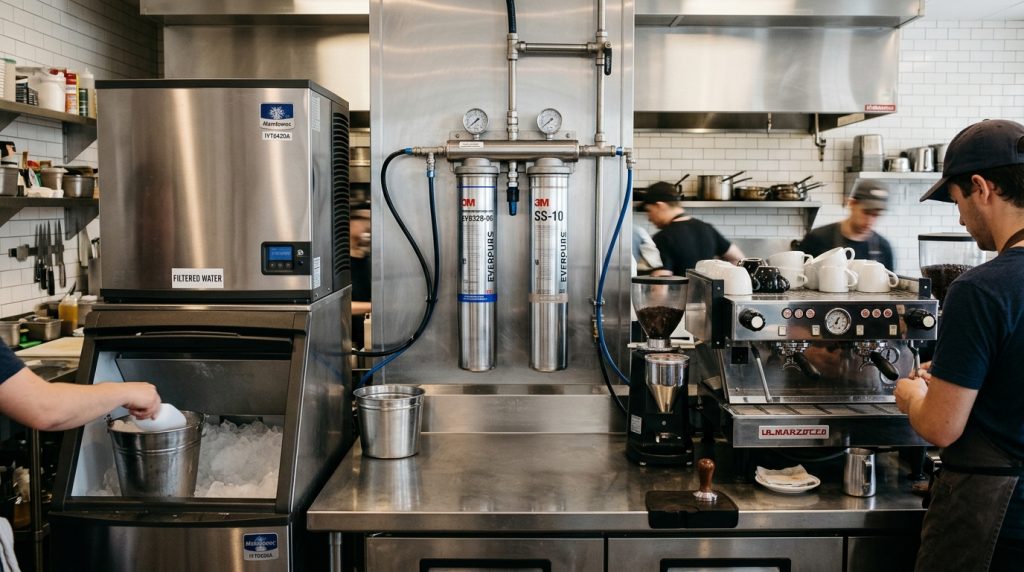 At minimum, restaurants need carbon filtration on ice machines and beverage systems to remove chlorine and improve taste. Many also benefit from water softening for steam equipment and dishwashers. High-end restaurants and coffee shops often add commercial RO for precise water quality control. The exact system depends on your water source, menu, and equipment.