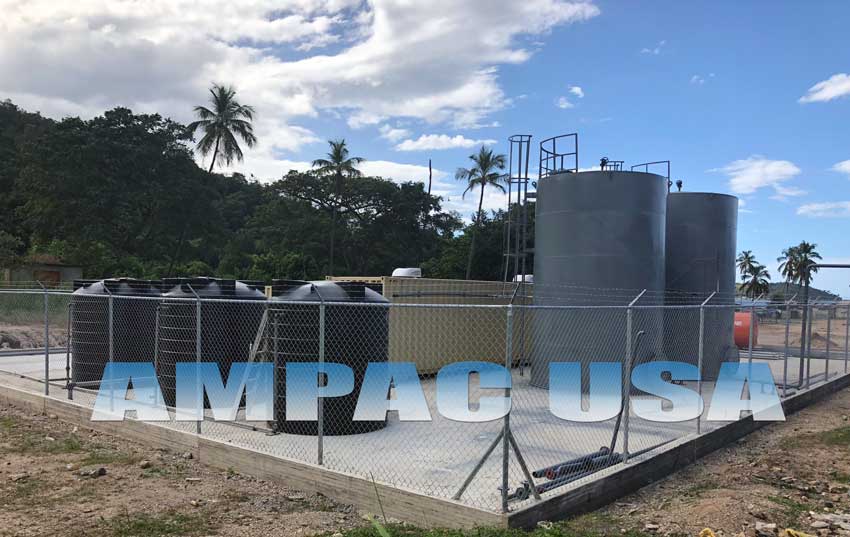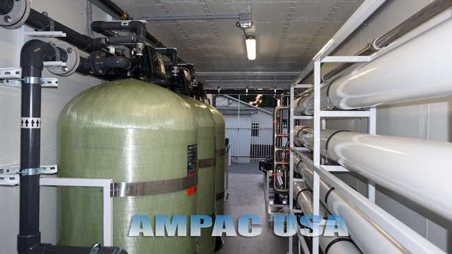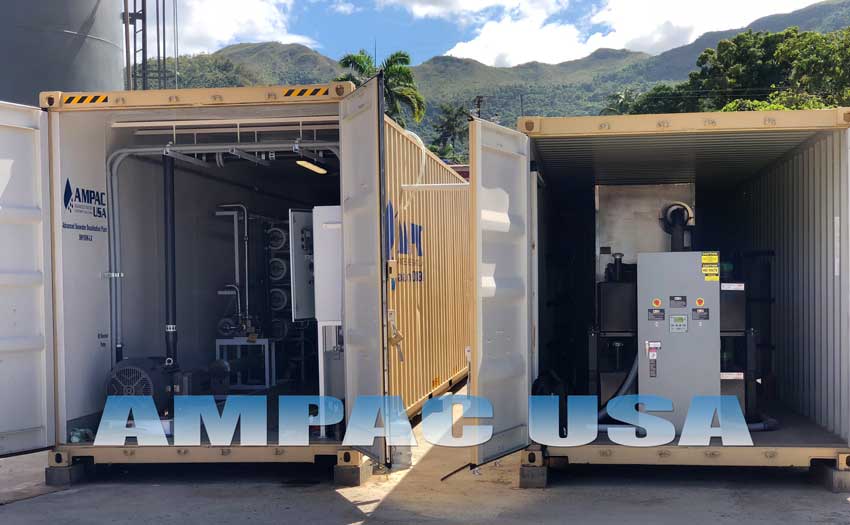 The Ampac USA Fully Packaged (Containerized) Seawater Desalination Watermaker System – Model: SW100K-LXC is a Fully Automated Turnkey System. This Seawater Desalination Plant is capable of producing 100,000 GPD (Gallons per day) (387m³/day), from Seawater to Pure Drinking Water, the plant includes all necessary Pre-Treatment Modules, Seawater Desalination Reverse Osmosis Process and Post Treatment Modules. This Seawater Desalination Plant includes Twin 40′ Containers, the first container is a 40′ High Cube that includes the Desalination Plant, and the second is a standard 40′ that includes Twin Alternating 250KW Diesel Generators to power the plant.
